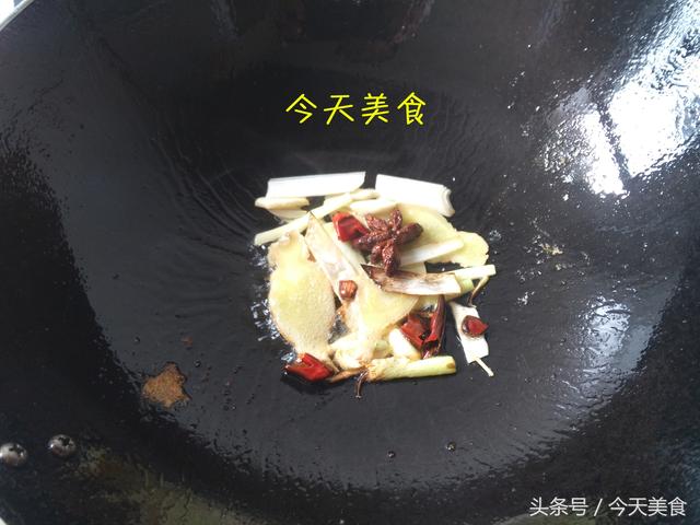 8、锅中留底油。放入葱姜蒜辣椒八角爆香。