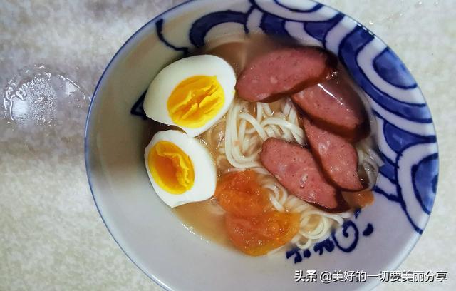 5、出锅。加入做好的糖心蛋。几片火腿肠就可以吃啦!