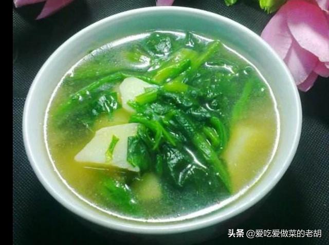 4菠菜粉丝汤:做法。把菠菜去根冼净。却成3厘米的段。起锅烧油下入葱姜蒜末爆香。下入适量的清水。下入菠菜。放入盐味精鸡粉。水开放入粉丝即可。口味清淡。