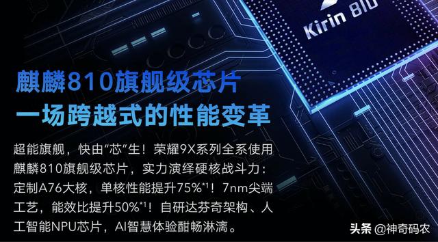 荣耀9X搭载了7nm工艺制程的麒麟810处理器。性能之强乃至目前为止在这个价位没有对手。这也正是荣耀9X号称“千元机杀手”的原因。