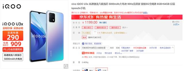 IQOO U3X是目前市面上最便宜的5G手机之一。其6+64G版只需要909元。不足1000元。如果预算不算充足且想要购买一款5G手机。IQOO U3X会是一个非常不错的选择。并且它还配备的是高通家族的骁龙480G 5G SOC。这款处理器的实际性能基本等同于上一代的骁龙730处理器。完全够用。