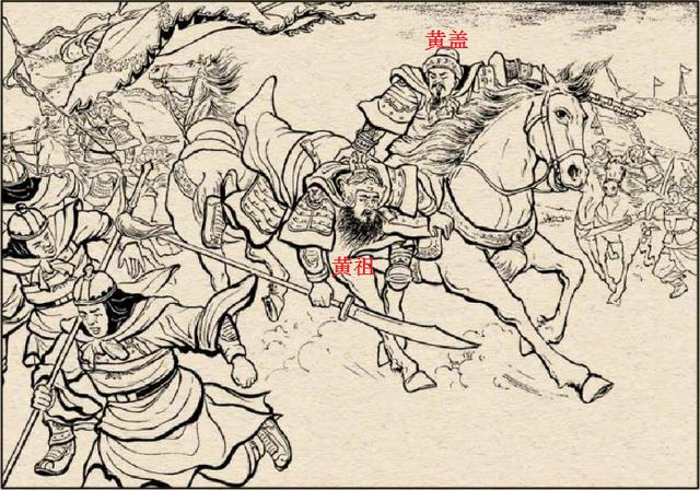孙坚被乱箭射死于岘山之后。黄祖、蔡瑁率兵杀出。江东军大乱。“程普保着孙策。急待寻路”。忽然遇到了吕公。程普奋勇向前。不到三合。将吕公一矛戳死。黄盖从水军赶来掩护。正遇黄祖。只两合。将黄祖生擒。