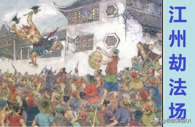 江州劫法场。李逵头一个从茶肆楼上跳下来。砍翻了刽子手。晁盖等人立即解救了宋江。跟在李逵后面杀出了江州城。黑旋风一路砍杀。来到了白龙庙。