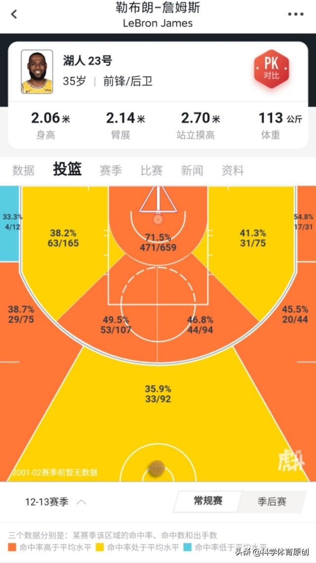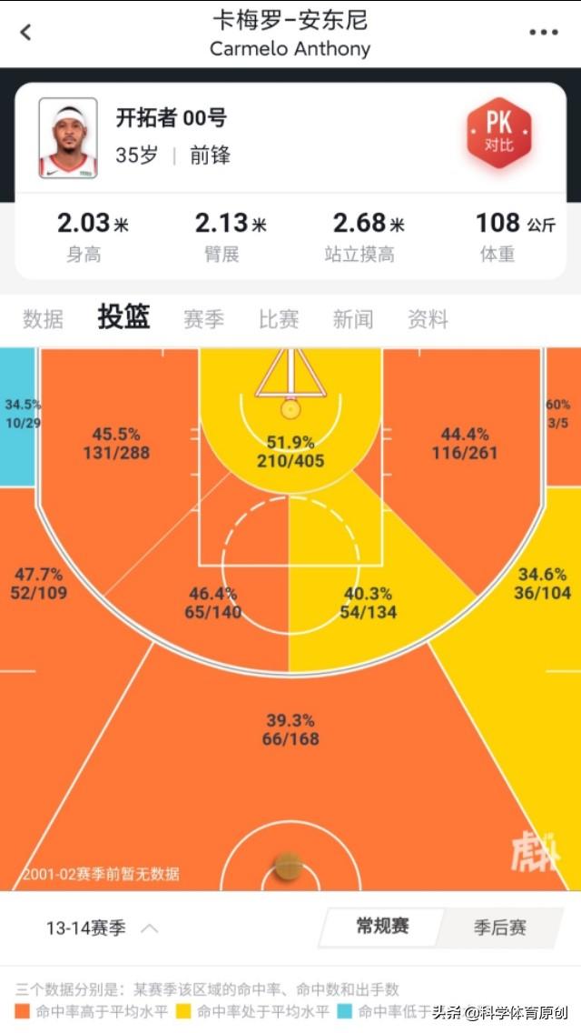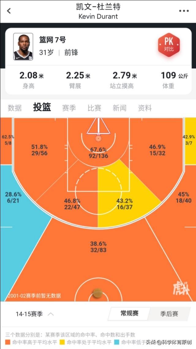 基本每个区域命中率都在平均线以上。他的臂展和长腿给他提供了太大的优势。