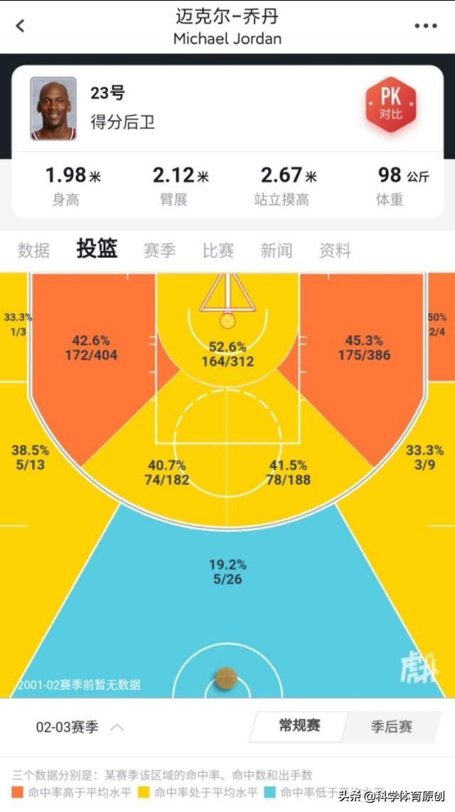 这是乔丹最后一个赛季。38岁时的投篮热图。还是这么高的命中率。确实难得了。