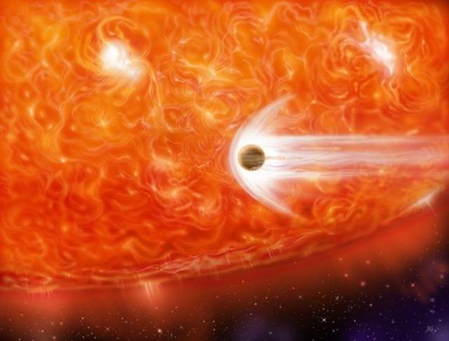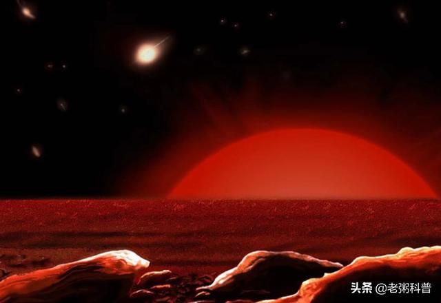 但太阳的寿命是有限的。到今天为止。太阳已经走完了它生命一半的旅程。在大约50亿年后。太阳烧光它内部的氢。从而蜕变为一颗巨大的红色星球。不断膨胀的太阳表面将到达今天火星的轨道。当然了。由于太阳的质量会减小三分之一。地球的轨道也会向外漂移。但它依然会在太阳的大气层中运行。