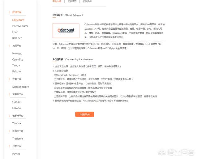 想要入驻这些平台。直接去他们官网。免费注册会员。注册成功后就可以申请相关平台开店了(如上图点击申请平台就行)
