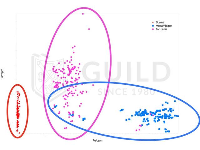 近 40 年来。GUILD收集了大量来自世界各地的红宝石A 类标样。积累了海量的测试数据。建立和完善宝石数据库。GUILD可出具莫桑比克红宝石产地报告。