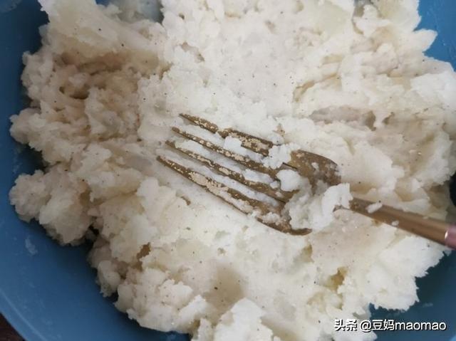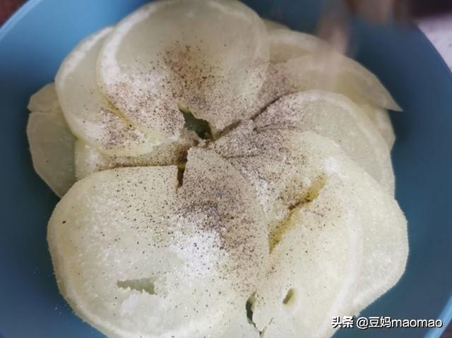 2、蒸熟的土豆片里。加入盐和黑胡椒碎调味。喜欢黄油的朋友可以加点进去。口感更好。