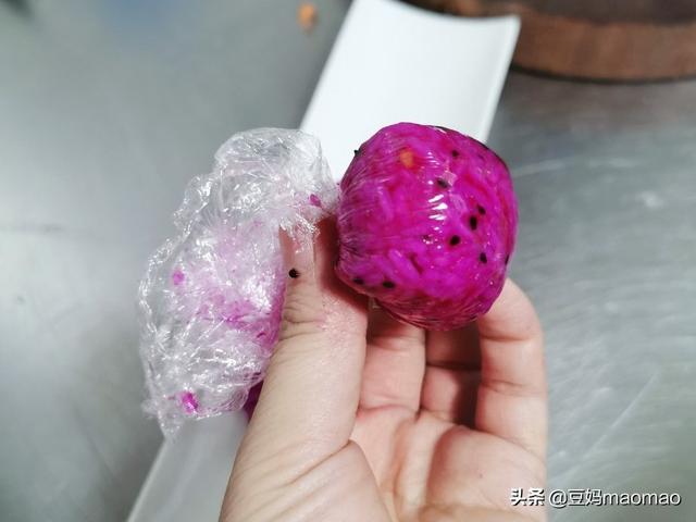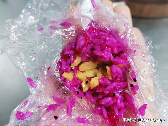 4、用一块保鲜膜。盛入火龙果米饭。包上切碎的大根条。