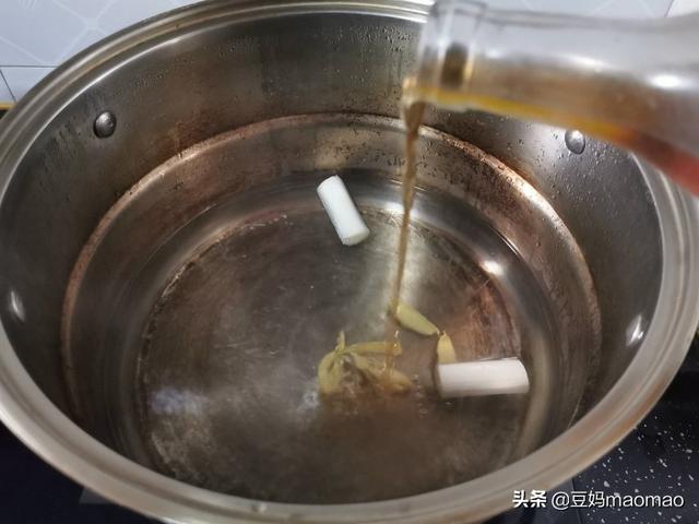 2、起锅烧开水。加入大葱2节。生姜2片。1勺料酒煮沸。