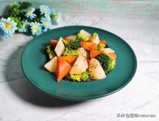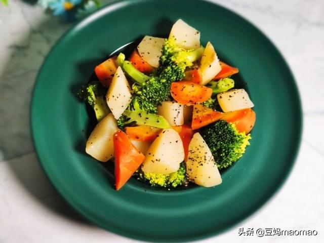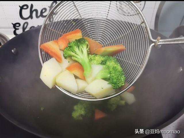 2、起锅烧开水。锅里加入1勺盐增加底味。放入土豆红萝卜煮1分钟。再倒入西兰花煮1分钟即可盛出控水。保证蔬菜全熟哦。