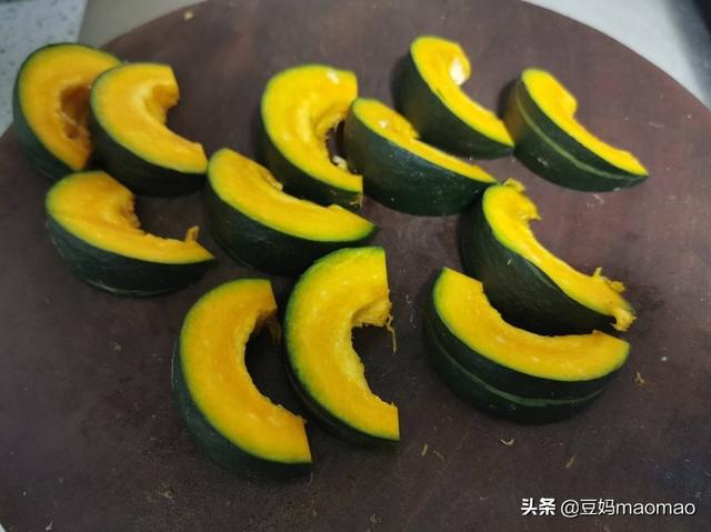 1、贝贝南瓜清洗干净。切成均匀大小的块。小一些相对熟的快点。省时间。
