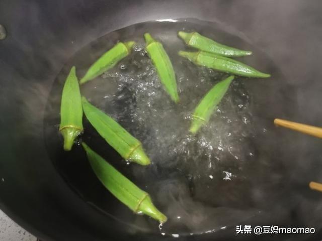 4、秋葵清洗干净。开水里放一勺盐。第一可以保持颜色。第二可以增加底味。再放入秋葵焯熟。
