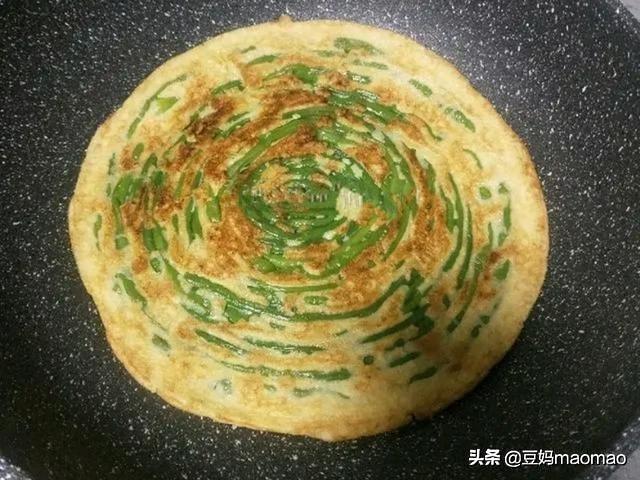 6、将豇豆饼。移至盘子或者锅盖。借助盘子和锅盖倒扣。给它翻面。这个翻面非常简单。绝对不影响颜值。再煎1分钟出锅。