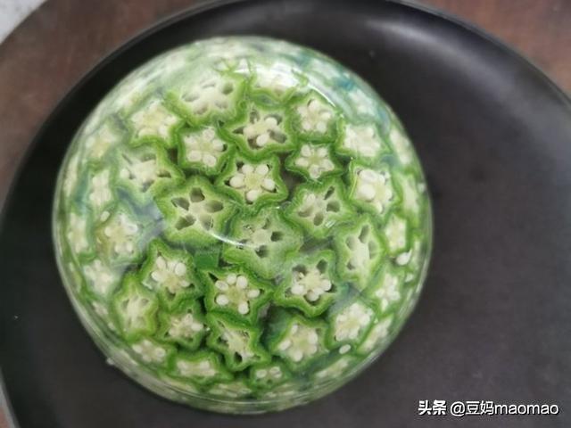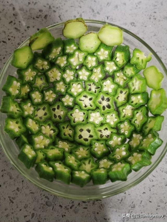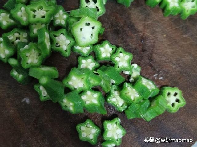 5、焯熟的秋葵去掉尾巴。再切成均匀大小厚度的薄片。