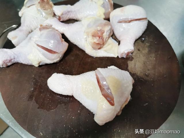 1、鸡腿清洗干净。每个鸡腿上划一道。这样更入味一些。
