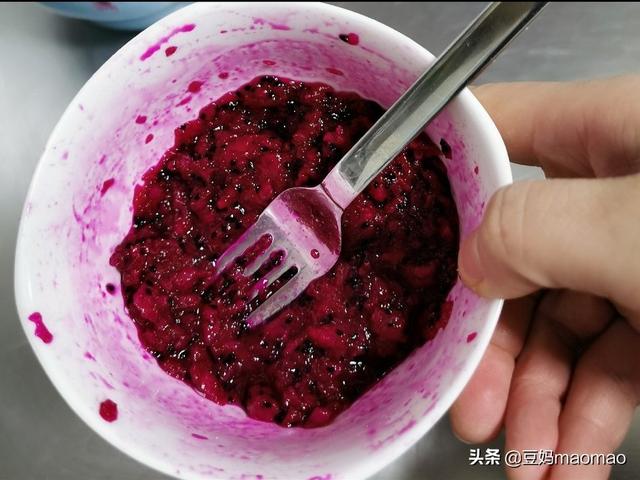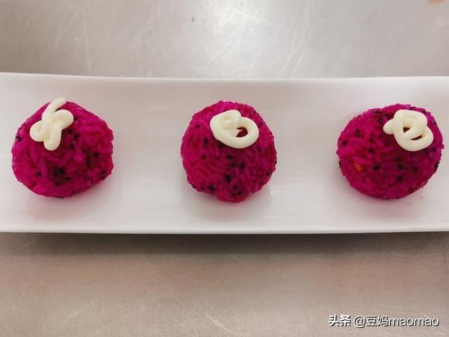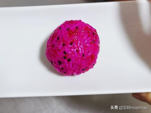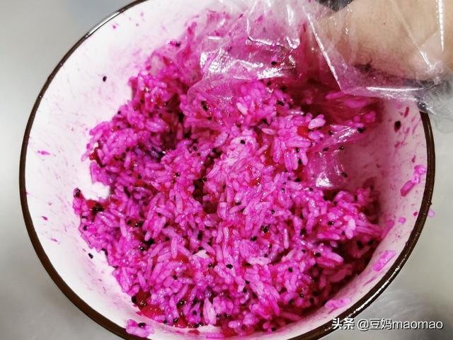 2、将火龙果倒入蒸熟的米饭里。抓拌均匀。