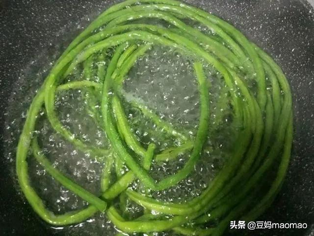 1、豇豆清洗干净。开水锅里焯熟。控水捞出。