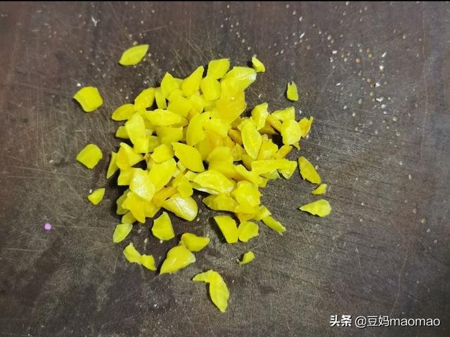 3、寿司大根条切碎。也可以随意更换自己喜欢的食物:肉松、酸黄瓜等。
