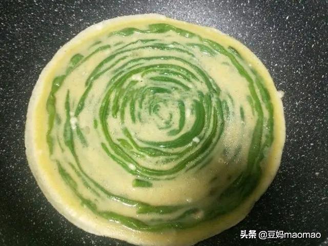 4、放入刚准备的鸡蛋面糊。摇动锅。恍均匀。