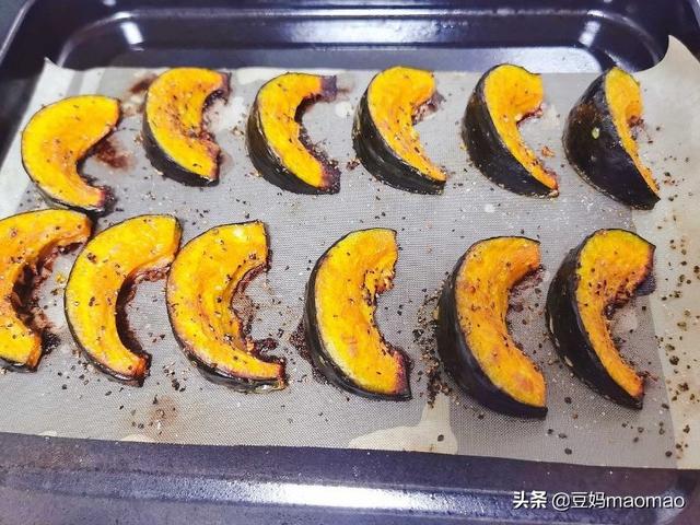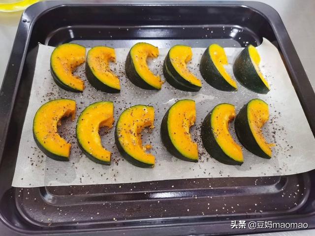 3、均匀的放入南瓜。撒上少许海盐。少许黑胡椒碎。