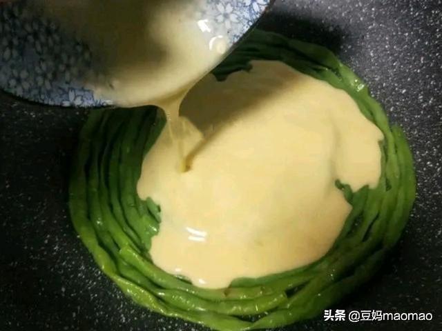 3、锅底刷油。放入煮熟的豇豆。盘整齐后开火。