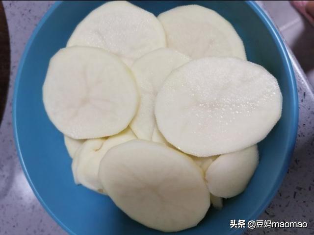 1、土豆去皮切成薄片。上锅蒸至软烂。