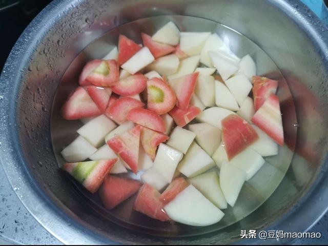 1、准备:红萝卜(红色)。土豆(白色)去皮。滚刀切成均匀大小的块状。泡在水里。西兰花也用剪刀剪成大小一致的小朵。