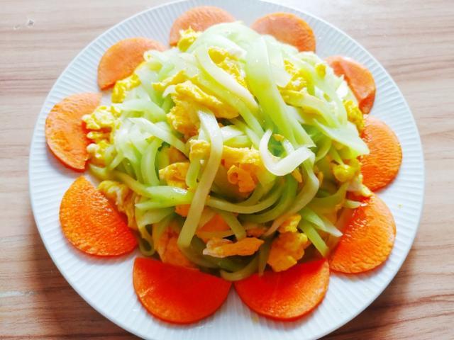 这道菜先把莴笋切丝用一点盐腌制。鸡蛋加水摊成鸡蛋块。胡萝卜焯水。最后大火爆炒。摆盘。是不是很简单?