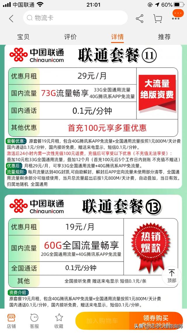 另外还有诸如联通的腾讯天王卡。19元可以包含40GB的全国专属免费流量。腾讯系、快速系、微博等等超过100多款APP免流量。也可也说是相当的划算。超过套餐外。可以升级到1GB/1元购买流量当日有效。也算是相当的便宜。