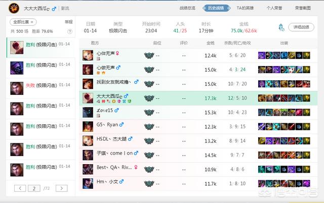 我们以其1月14日的面板为例。他在1月14日合计玩了45局游戏。游戏时间从00:28——23:48。也就是说他这一整天里几乎就没有休息过!假如说他就一天两天这样也就算了。问题是小编往前翻了几十页。发现这个号每天都是如此——这就很明朗了。这个号肯定不是一个人在玩。而是至少是3个人以上在玩。不然不可能做到每天每日都24小时在线!