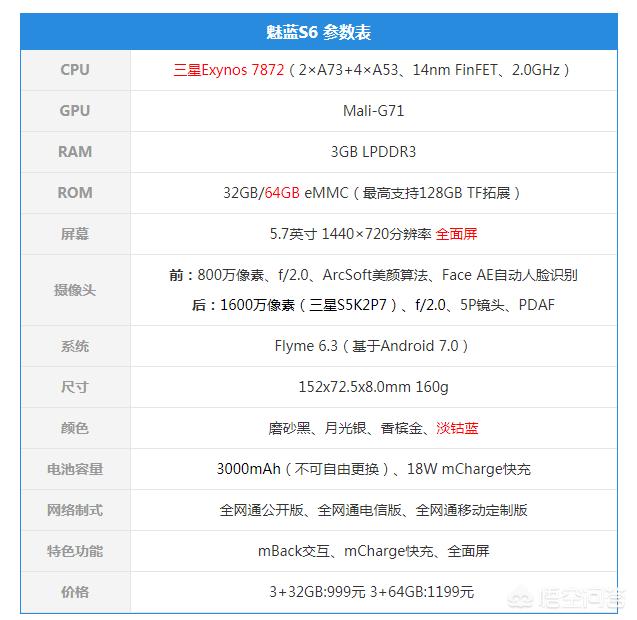 魅蓝S6搭载了三星Exynos 7872六核处理器。最高配备3GB RAM+64GB ROM的内存组合。采用5.7英寸全面屏设计。内置3000mAh容量电池。支持18W快速充电。这一个配置可以说不错的。而且配备了最新的全面屏。