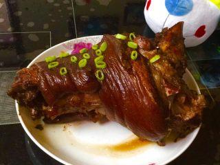 9:最后大火收汁将肘子捞出。撒上芝麻和香菜点缀即可。色香味俱全的酱肘子就出锅喽。