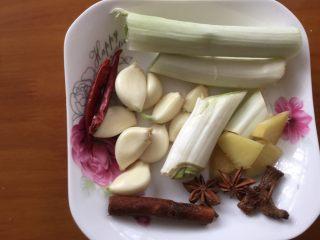7.葱姜蒜。辣椒。大料。桂皮。小荤香备用。