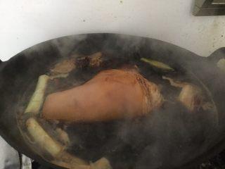 4.锅开后转小火。肘子太大了要翻过来在煮令一面。去掉血水捞出沥干。