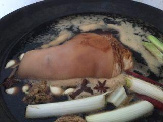 7:转成中火炖至一个小时。开盖加入盐、生抽、老抽。继续中火熬制一个小待肘子入味;