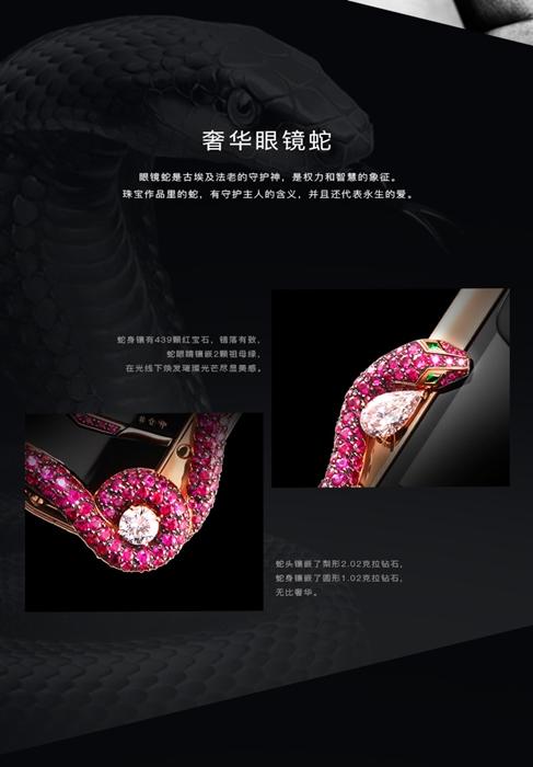 “眼镜蛇”由 VERTU 与法国皇室珠宝品牌 Boucheron 联手推出。以眼镜蛇裱框特别吸睛。蛇身镶嵌 439 颗红宝石。两颗绿宝石和两颗钻石。键盘中央还以红宝石做铺垫。限量版手机由8名设计师。耗时4年时间全手工打造。每一部堪称独一无二。
