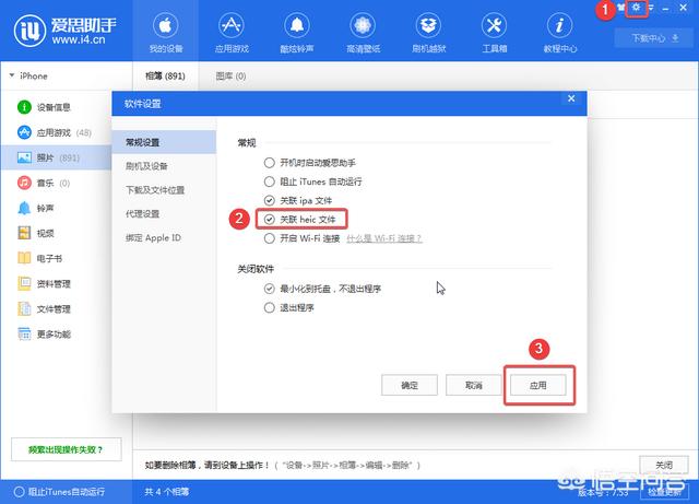设置方法:打开爱思助手PC端。点击右上角齿轮“设置”。在常规设置中将“关联 heic 文件”勾选上后。点击“应用”即生效。