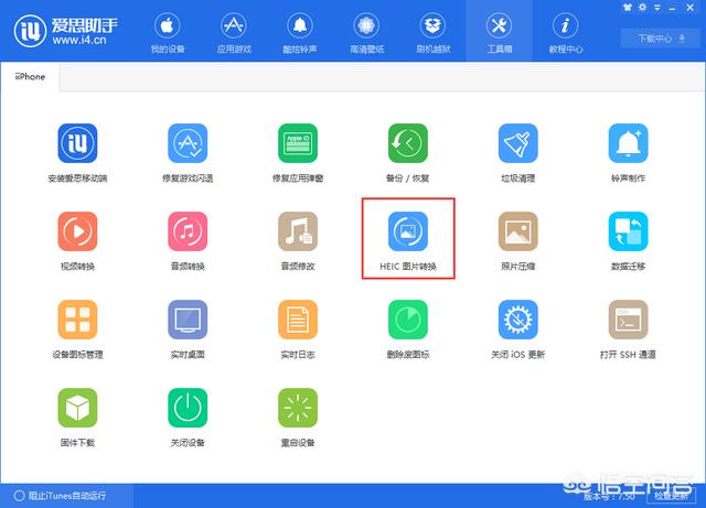 1、打开爱思助手后点击“工具箱 --> HEIC 图片转换”进入图片格式转换界面;