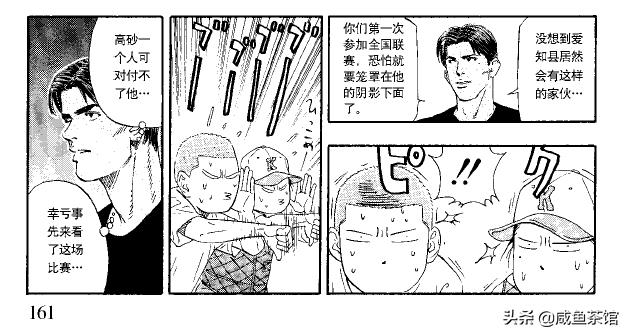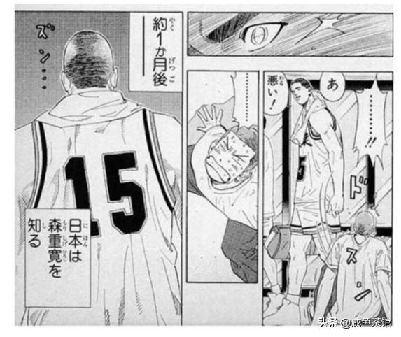 而且在漫画剧情年森重宽被吹得神乎其神。这跟动画改编。漫画翻译也有关系。在樱木挑衅宽哥。然后被撞翻在地之后。旁白有一句话。国内被翻译成了“一个月后。森重宽名震日本”。而从比赛时间线来看。感觉这是预告宽哥拿冠军了。