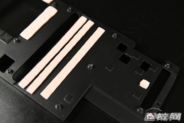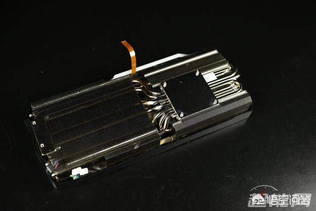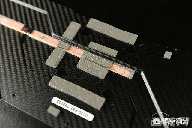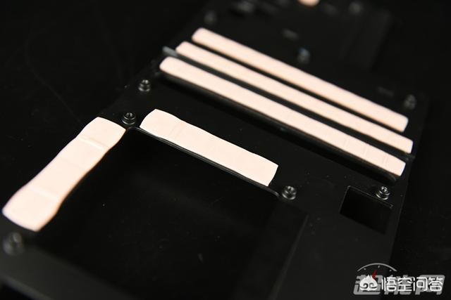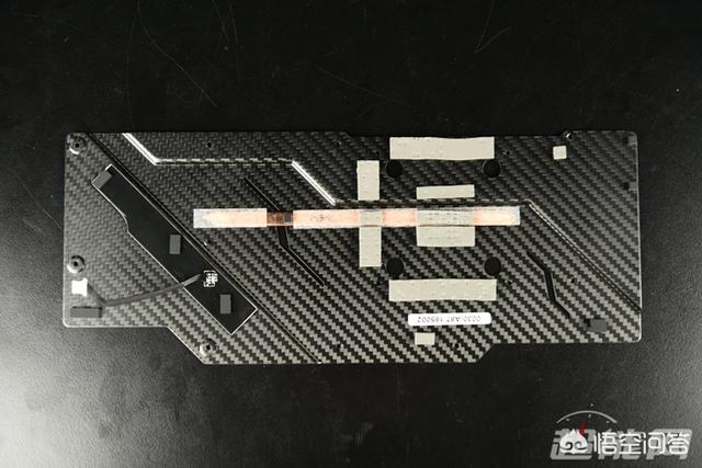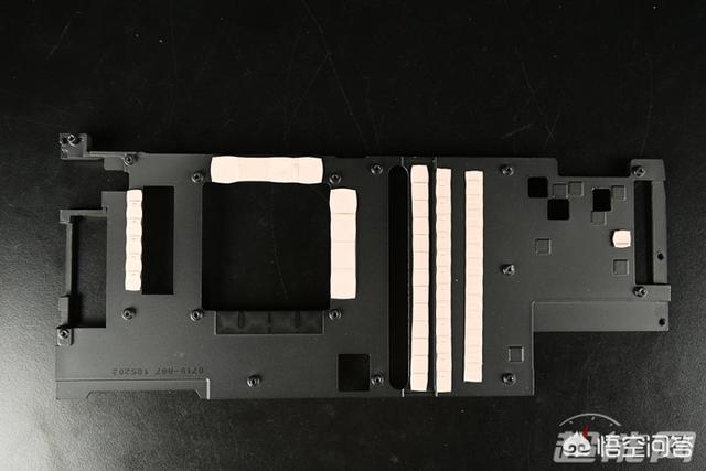 全部拆除后就能看到散热器、背板、金属框架、PCB板这四部分。我们一部分一部分的来看。首先是背板针对核心、显存背面的 位置留出大量的导热膏。并且还有一条热管用于引导热量。铺设导热膏或许常见。但是铺设热管在背板设计中就非常少见。然后就是金属框架部分。 跟很多其他高端显卡类似。微星闪电的金属中层框架有铺设大量的导热膏以降低显存、电感、MosFET还有聚合物电容的温度。整块框架非常厚实且面积不小。像一件衣服。而且还有额外的突起以增大热交换接触面积。不过那看起来仿佛导热管的纹路应该是纯粹的装饰作用。