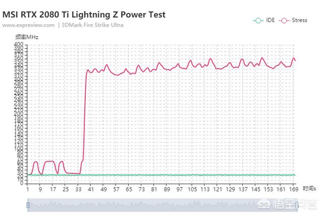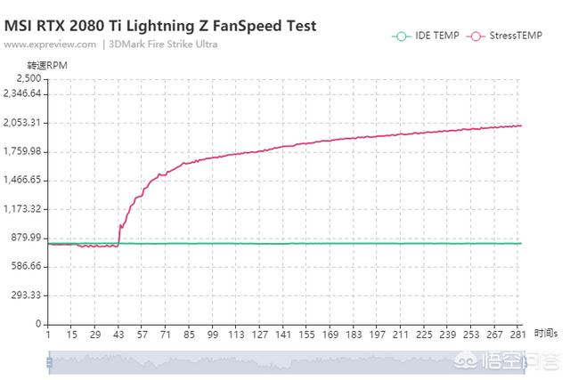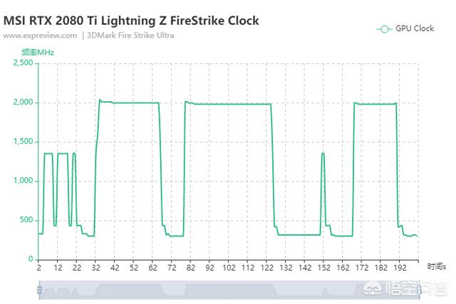 为更好展示需要转动风扇才能展示的视觉残留灯效。默认的BIOS当中RTX 2080 Ti Lightning Z是没有待机停转功能的。在待机的时候会保持830RPM左右的转速。需要切换到LN 2 BIOS才能启动待机停转。而在随后的压力测试中则表现出较高的转速。最高达到2000RPM左右。看来为压制高频的TU102大核心确实压力不小。另外在压力测试当中的频率方面。相较于一开始的接近2000MHz左右的高频率。会逐渐降低到1965MHz。然后会慢慢降低到1950MHz。最后是1935MHz。