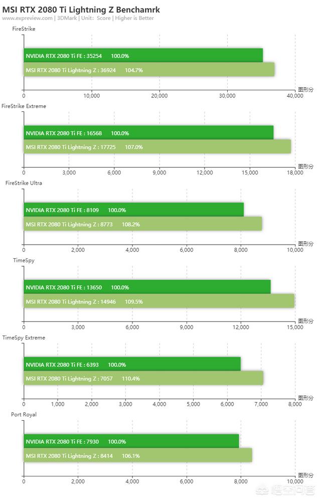 以3DMark的测试数据来看。RTX 2080 Ti Lightning Z显卡的默认性能相当顶级。能够超过公版的性能最多10.4%(TimeSpy Extreme)。最少则是FireStrike项目。幅度是稍稍较不起眼的4.7%。不过大家要知道公版RTX 2080、RTX 2080 Ti的性能原本就是非常强的。