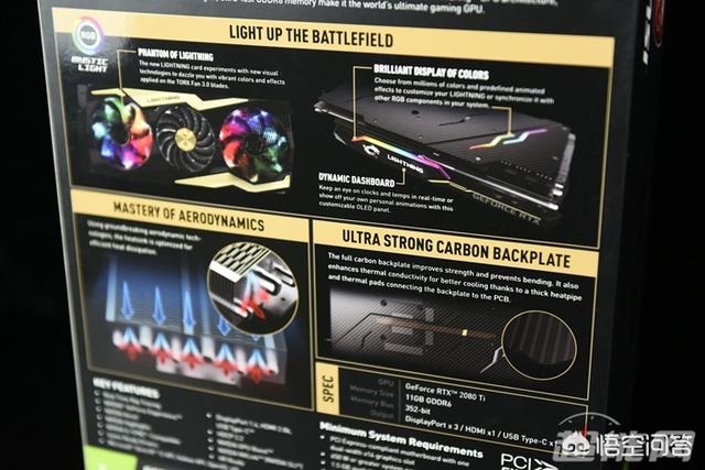 还是从外观方面开始看。微星RTX 2080 Ti Lightning Z的包装盒是竖置设计的。整体看上去很厚重。其实大家会发现外包装的设计还是有些犹抱琵琶半遮面的:它并没有完全将显卡的正面对着我们。但是围绕在整流罩边缘的纯金点缀是你根本不可能无视的。而且仔细看。中央那副风扇的中心部位。还有扇叶的边缘部分都有金色的装点。最隐蔽的就是顶部加装的屏幕。目前高端显卡在顶部加装显示屏以显示屏幕、温度、自定义信息等。现在RTX 2080 Ti Lightning Z全都要!不过这里处理得真的很低调。跟背景一致得黑色让它很难被发现。