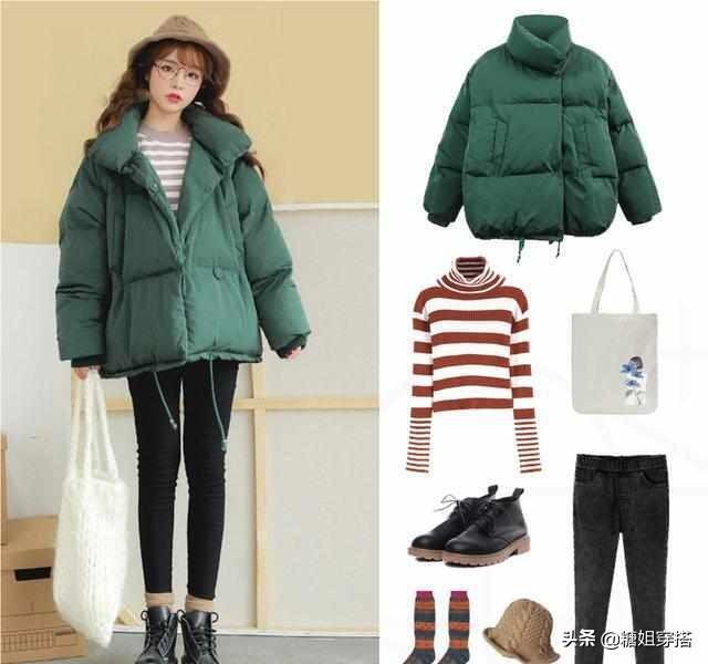 羽绒服是冬季保暖的必备单品。绿色的面包服搭配条形毛衣简约有时尚。一条打底裤更能显出腿部的线条。洋气又保暖。