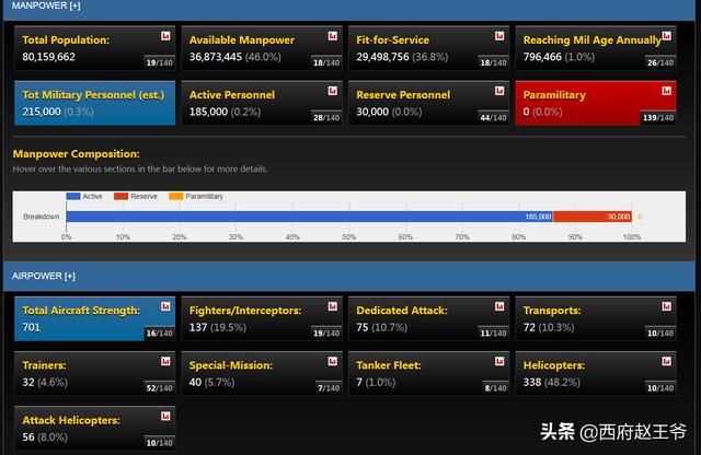 根据全球火力指数提供的数据。2021年德国的常备兵力为18.5万人。此外还有3万储备部队。所以总兵力应该是21.5万人。不得不说。这点儿兵力是真的不够看。尤其是常备兵力这一块。其在上榜的140个国家和地区里面。只能排到第28位。