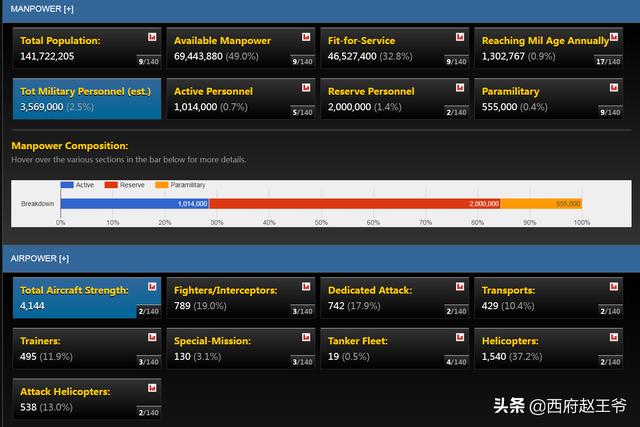 事实上。在主战装备方面。差距还要更加明显一些。比如在航空战力方面。当前俄罗斯装备的军用飞机总数能够达到4100余架。排名全球第二。其中战机是789架。直升机则达到了恐怖的1500多架。其中包括500多架武装直升机。