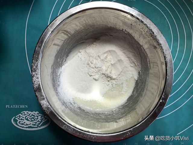 2、过筛加入低粉。用手抽z字形拌匀至无干粉状态。