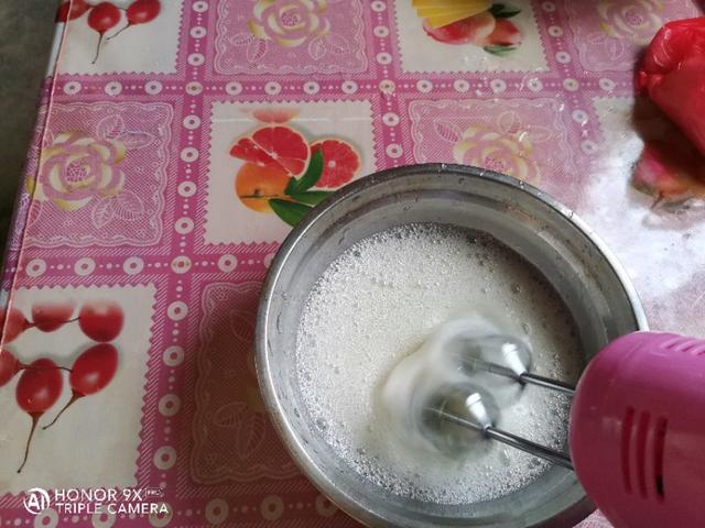 6.蛋清中放几滴醋白醋。电动打蛋器将蛋清高速打发至蛋清呈现鱼眼泡时。加入1/3的白糖。白糖分三次放入。